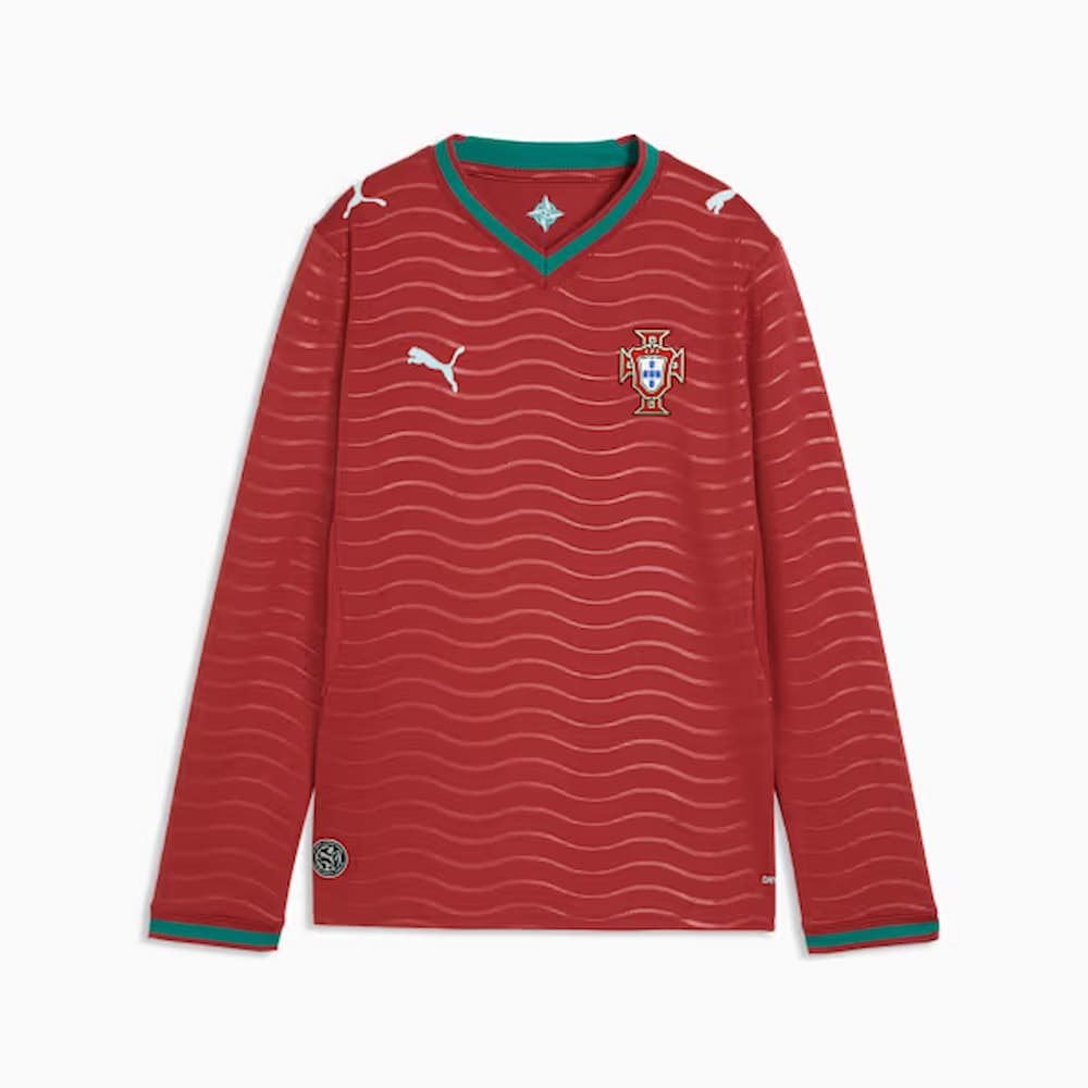 Le maillot domicile du Portugal incarne l’énergie de l’océan et l’intensité d’une équipe prête à briller sur la plus grande scène. L’emblématique base rouge est ornée d’un motif ondulé et de touches de vert, un clin d’œil aux racines maritimes du pays et à son esprit intrépide. Un design qui parle à celles et ceux qui sont nés pour explorer et vivent pour jouer, « por amor à camisola ». Conçu pour les supporters, le maillot à manches longues allie l’allure portée en match à une coupe, des détails et des matières décontractés, idéal pour les jours de match comme au quotidien.